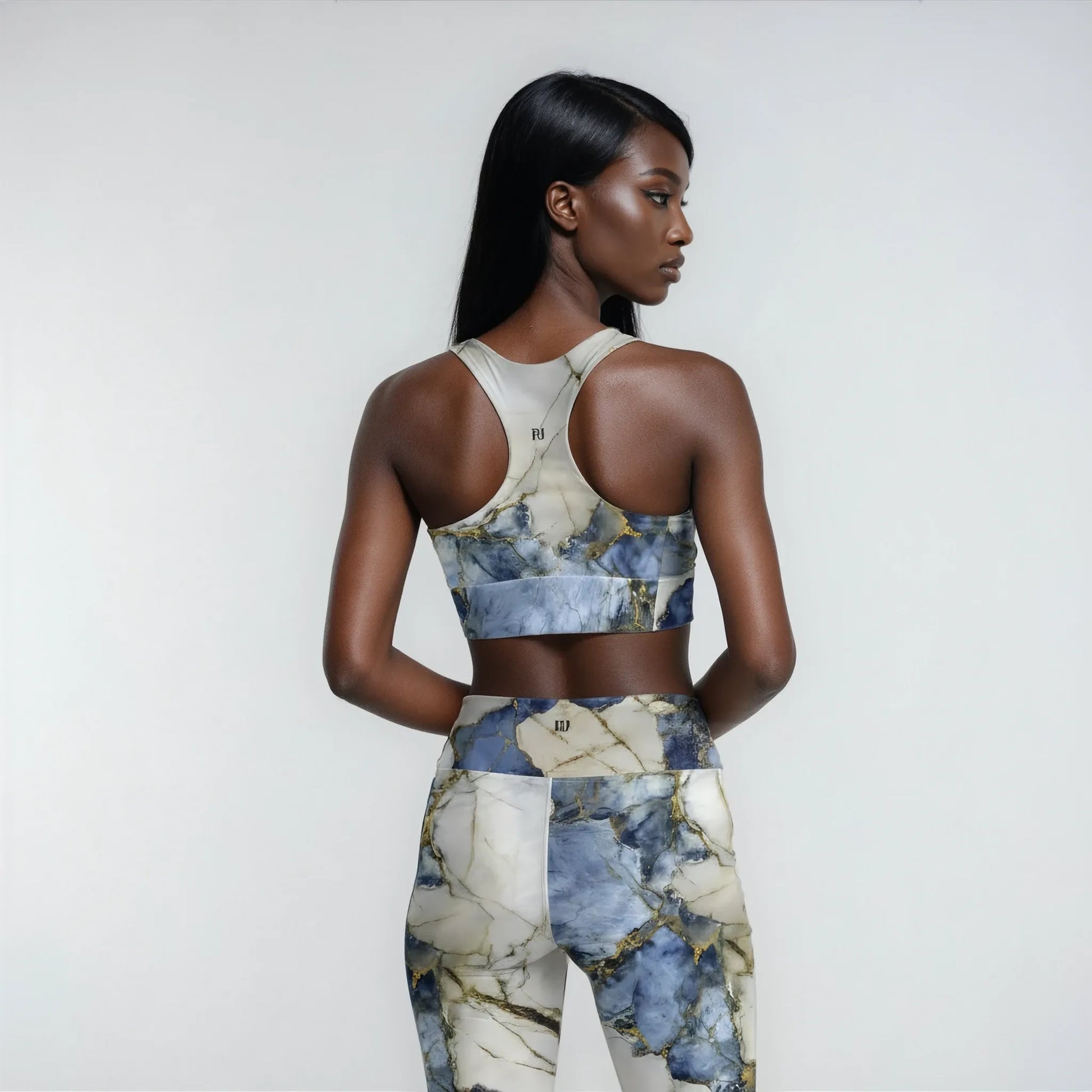 This marble yoga bra brings art and flow together — soft swirls of blue, white, and gold create a calm yet powerful look that moves with your energy. Made from breathable, stretchy fabric, it supports your practice while feeling light and effortless against the skin.